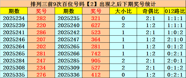 百位号码:百位上期奖号为2路、奇数、大号:2,历史上百位号码2共开出742期,前一次开出期数在第2025335期,上期奖号隔4期再次开出。