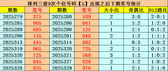 个位前9次开出号码5时,该位下期奖号离别为:9-1-5-8-2-5-8-9-0,其中号码个数大小比是6:3,012路比是3:1:5,奇偶比是5:4。